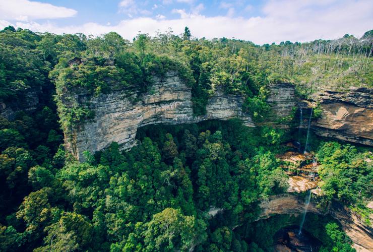 Veduta di scogliere rocciose e cascata nel Blue Mountains National Park del New South Wales © Tourism Australia