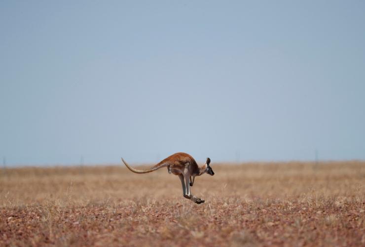 캥거루는 강력한 뒷다리 힘을 이용해 놀라운 효율로 엄청나게 멀리 뛸 수 있습니다. 실제로 캥거루는 큰 동물들 중 유일하게 점프를 통해 이동합니다. 정말 큰 캥거루의 경우 한 번 뛰어서 8미터까지 이동할 수 있습니다. 사람이 같은 거리를 이동하려면 열 발자국 정도 가야 합니다.