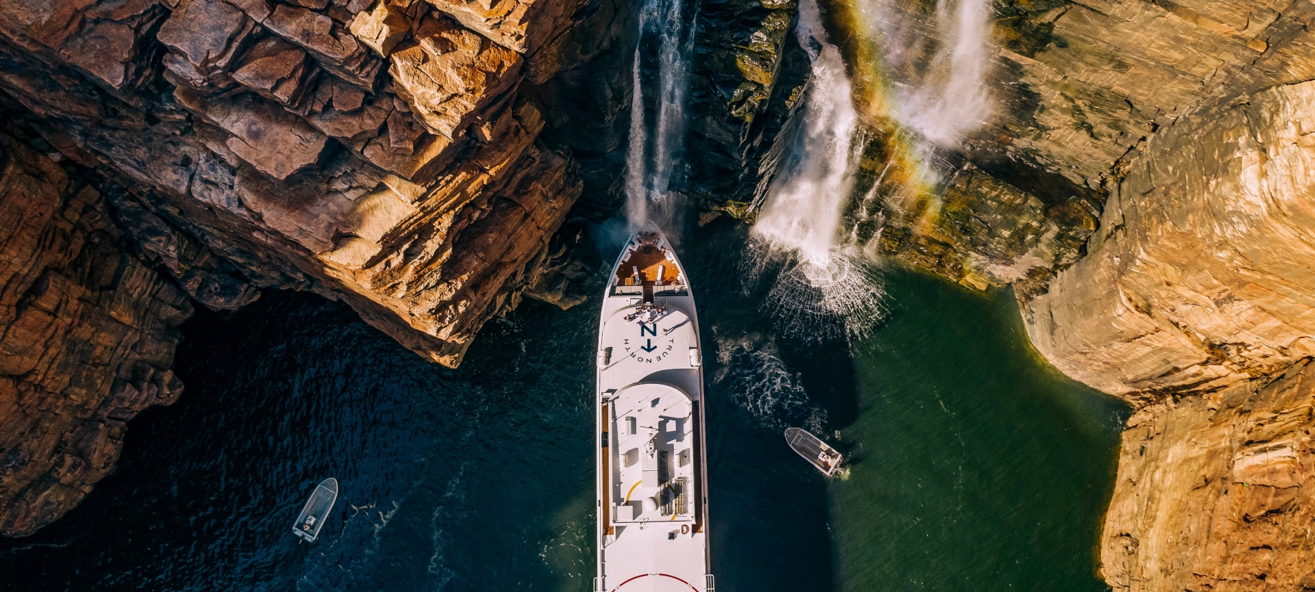 澳洲的西北角擁有數以千計的島嶼、巨大的銹紅色峽谷、壯觀的猴麵包樹及世上最雄偉的岩畫藝術而著稱。由於其海岸線不設公路,僅可透過海路遊覽。金伯利(Kimberley)的自然奇觀令人難忘,包括蒙哥馬利礁(Montgomery Reef)退潮形成的海中瀑布,以及水平瀑布(Horizontal Falls)的急流。豪華探險船通常在4月至10月期間往返布魯姆(Broome)及達爾文(Darwin)。